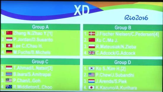 混双同样是16对选手分成四个小组,每组四对选手,小组前两名晋级八强,进入淘汰赛阶段后重新抽签决定对阵。头号种子张楠/赵芸蕾同组对手有印尼的乔丹/苏桑托、德国的福克斯/米切尔斯、中国香港的李晋熙/周凯华。从实力分析他们小组出线不成问题,不过想获得小组第一并非毫无悬念,乔丹/苏桑托近期进步神速,拿到了今年全英赛的冠军。过去张楠/赵芸蕾对他们保持七战全胜的交手记录,但在今年全英赛上却以0-2输给了这对选手,双方再度交手,将会是一场激烈的拼争。
