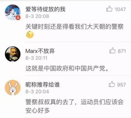 小新希望在异国他乡的同胞们都可以愉快地享受奥运,远离危险。不过,虽然咱们从来不惹事儿,但遇到事儿也绝对不怕事儿,因为,我们有困难可以找警察!老家自带的!