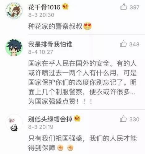 的确,在异国他乡看到来自祖国的警察叔叔,心情肯定会更加不同吧!这位名字有点儿污的网友@别低头绿帽会掉 说得真好:只有我们祖国强盛,我们的人民才能得到保障!