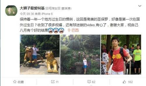 8月3日是羽毛球女双运动员唐渊渟的生日,今日上午她在微博发文:“保持着一年一个地方过生日的惯例,这回是南美的圣保罗,好像是第一次在国外过生日?收到了很多祝福,还有球迷做的video,有心了,谢谢大家,祝自己八月有个好的结果!”